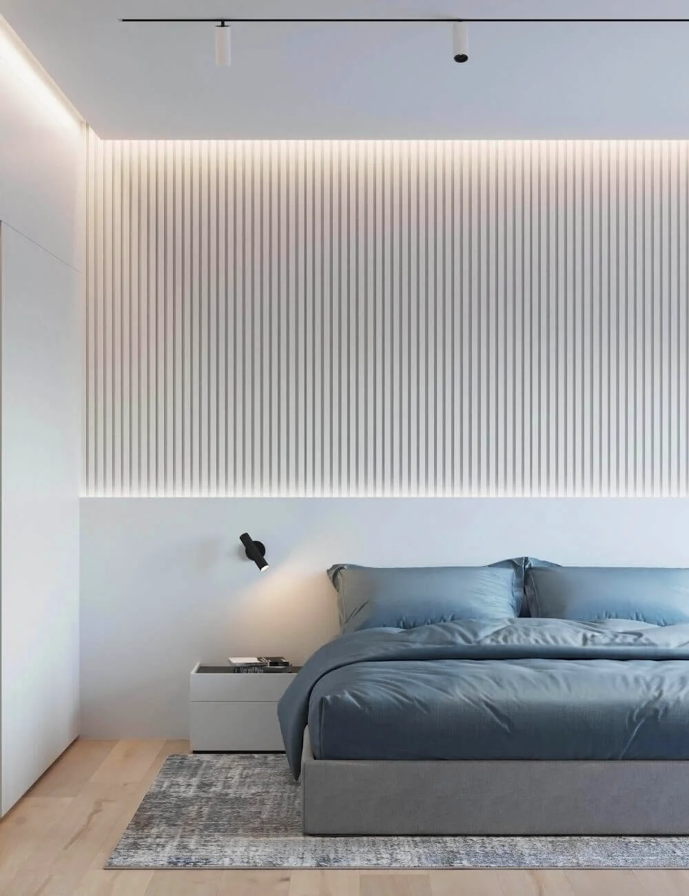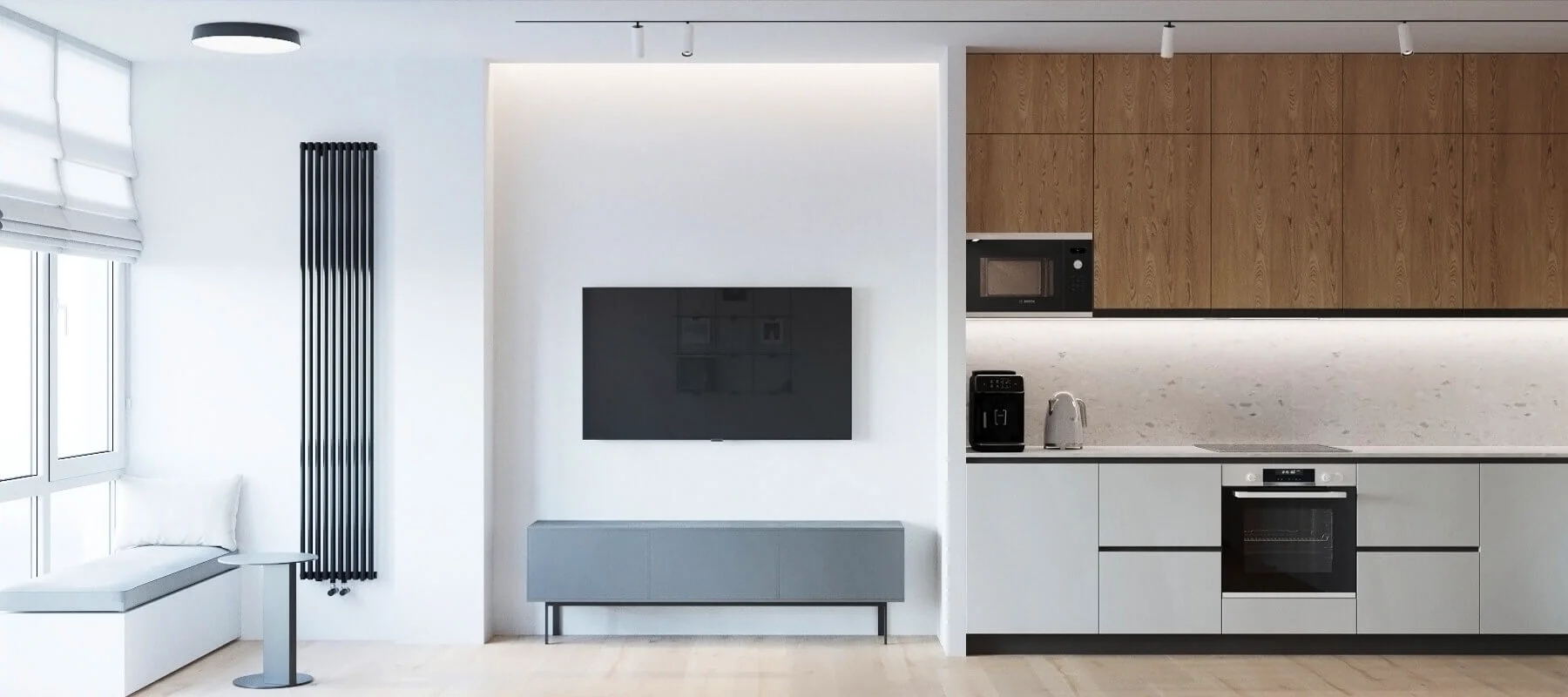 Квартира исполнена в современном минималистическом стиле. В площадь 65 м2 уместились – объединенная кухня-гостиная, мастер спальня, гостевая спальня и две ванные комнаты. Главным пожеланием заказчиков было создать максимально светлое пространство.