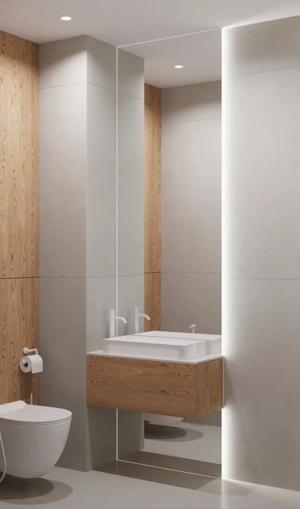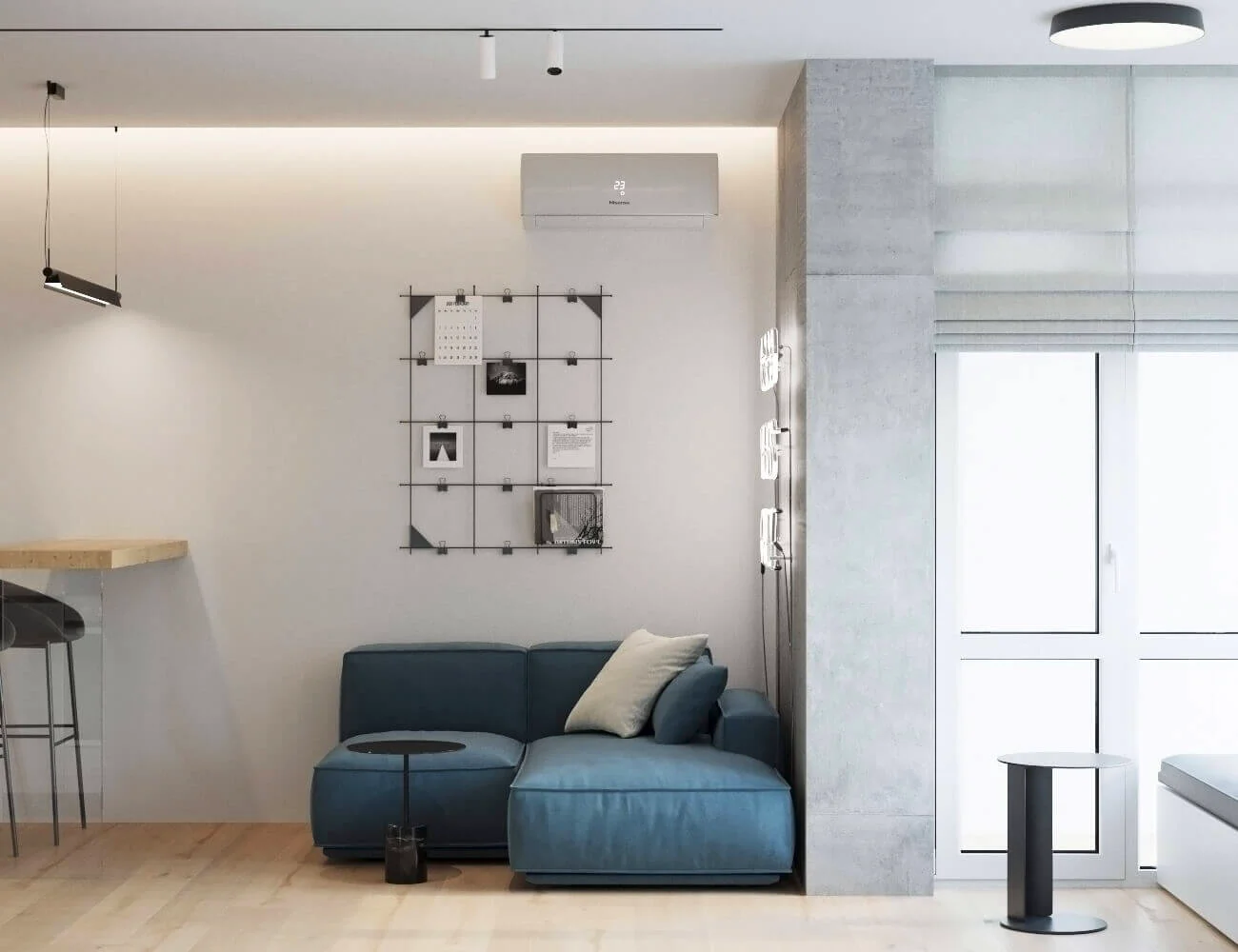 Акцентами стали – дерево светлого оттенка и синий цвет, именно они придали цвету и натуральности пространства.