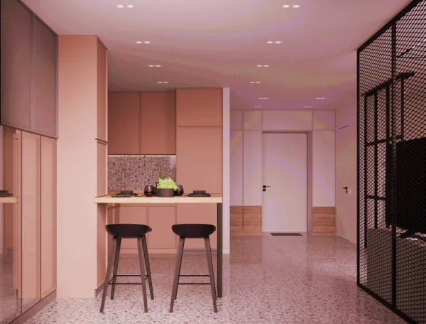 Яркий акцент проекта – цветовая палитра и пастельные элементы в кухне.