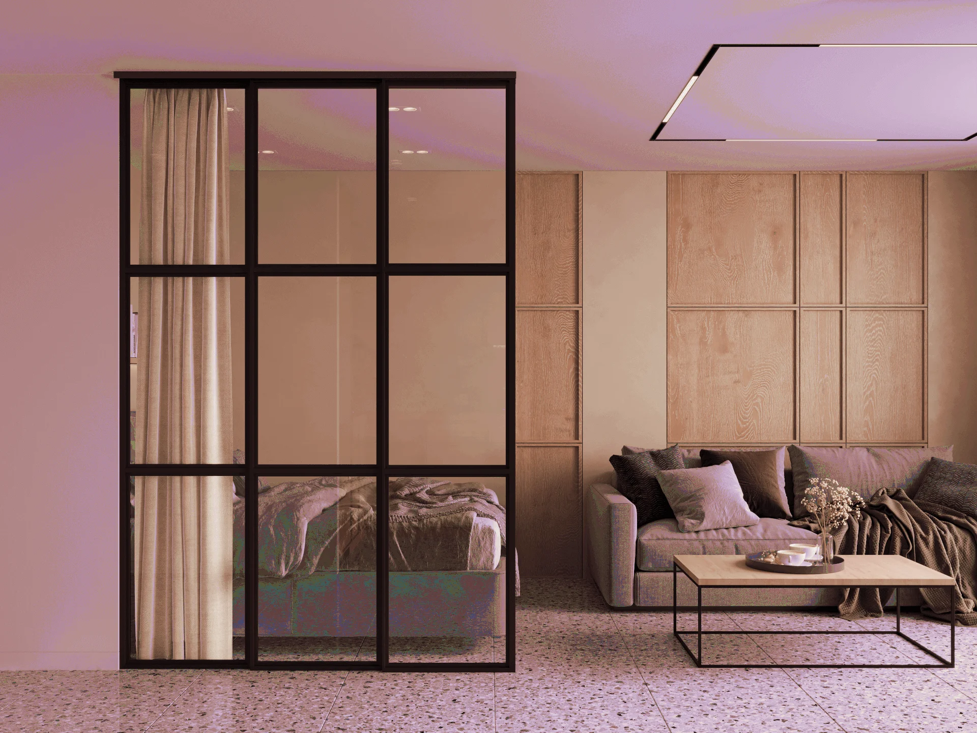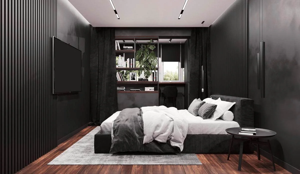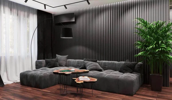 Стены обработаны мебельными панелями и декоративной штукатуркой, что придает разнообразие фактур и натуральность в пространстве