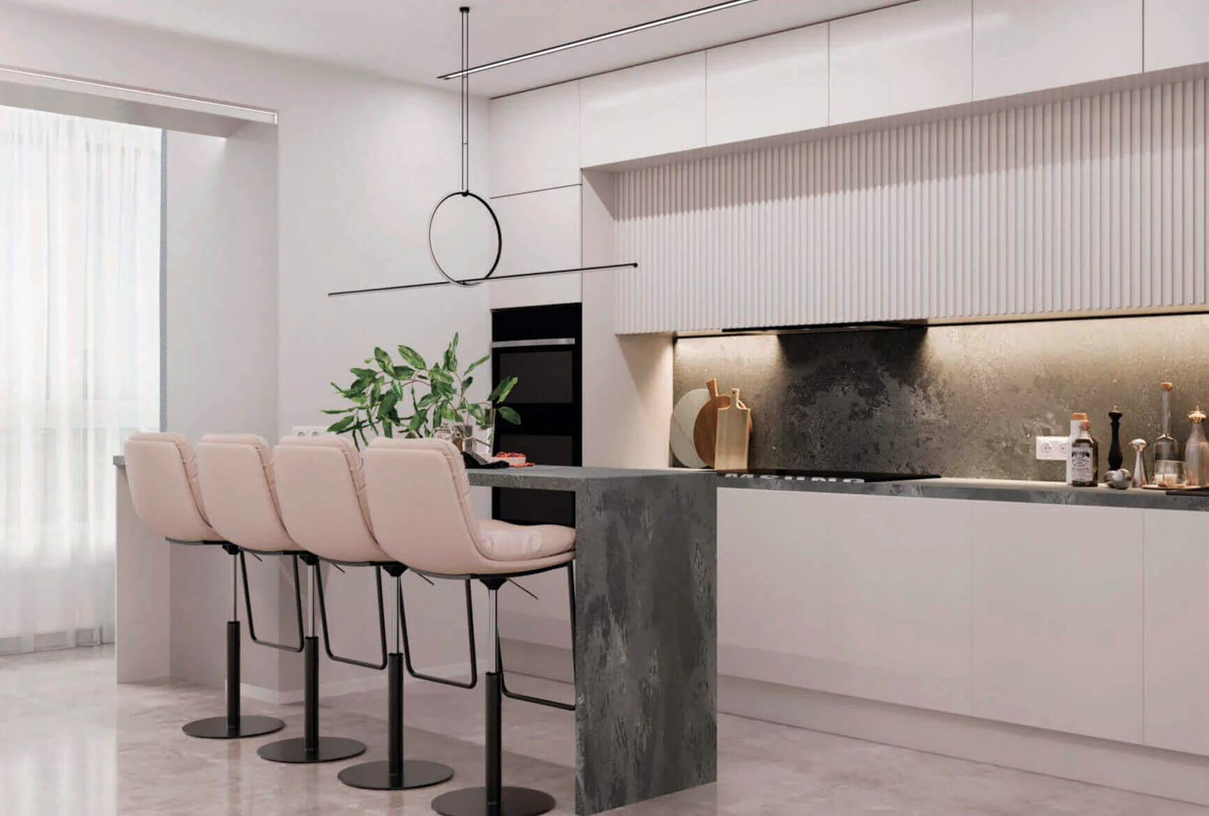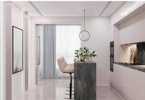 В ванной комнате использована керамогранитная плитка с каменной текстурой, подобная плитка использована на фартуке кухни. И самое любимое место заказчика – остров с барной стойкой, именно там можно и готовить ужин, завтракать, ужинать и проводить время с родными за одним столом.