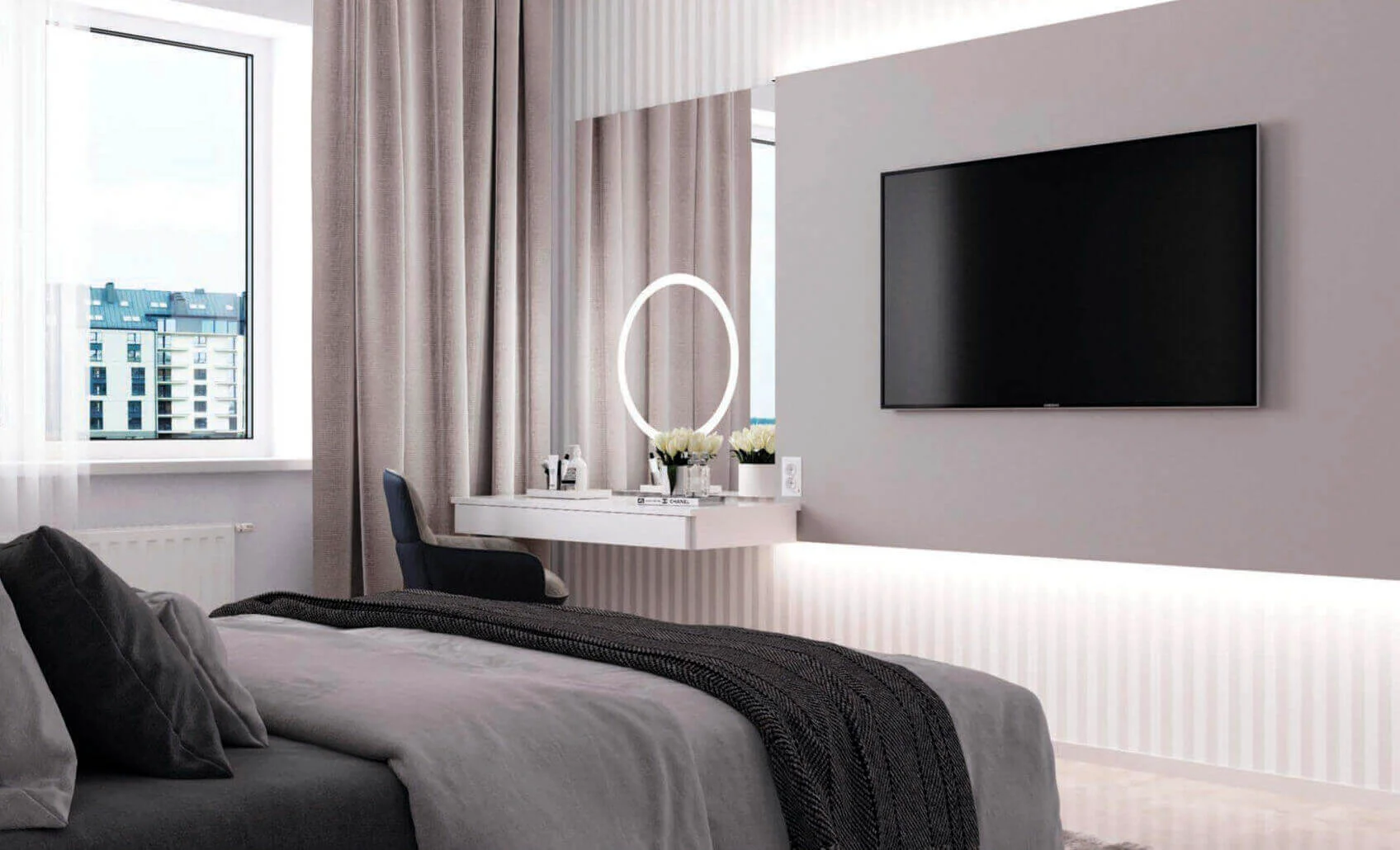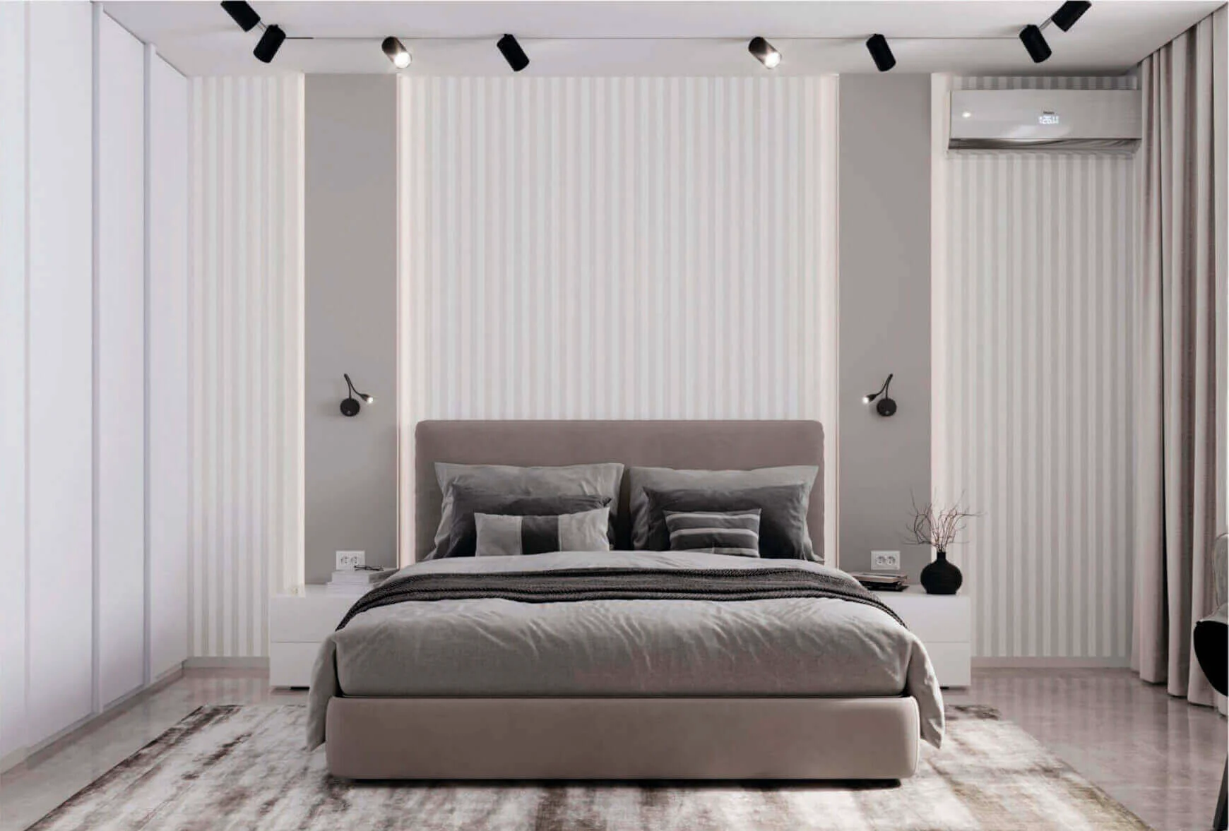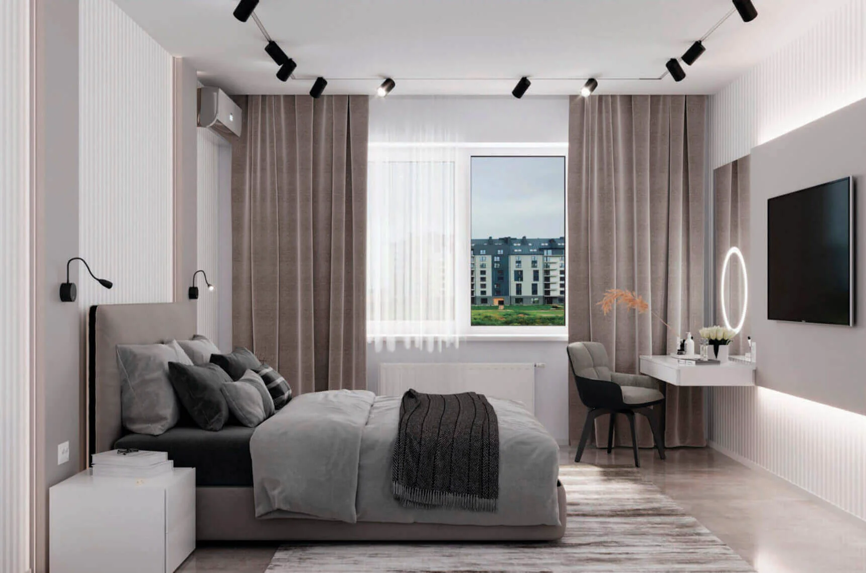 Спальня производится в светлых оттенках и с использованием локального света.