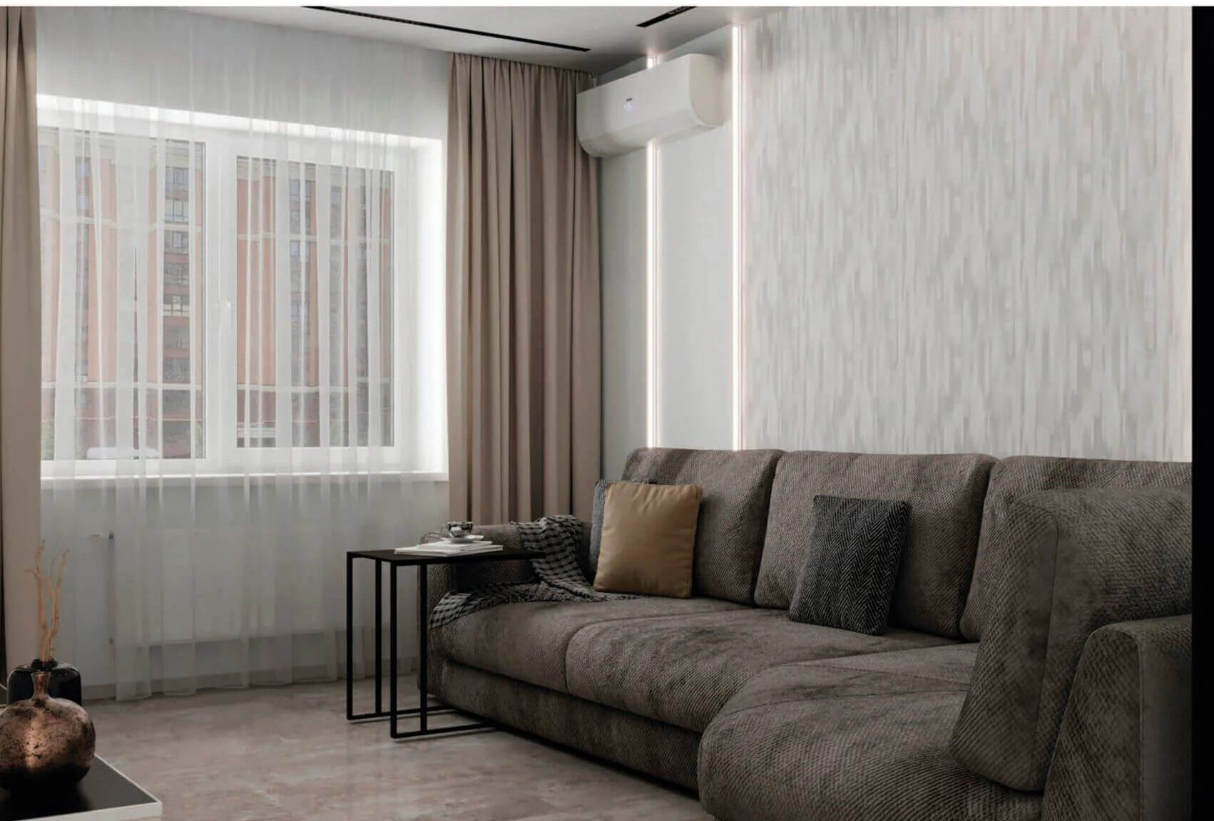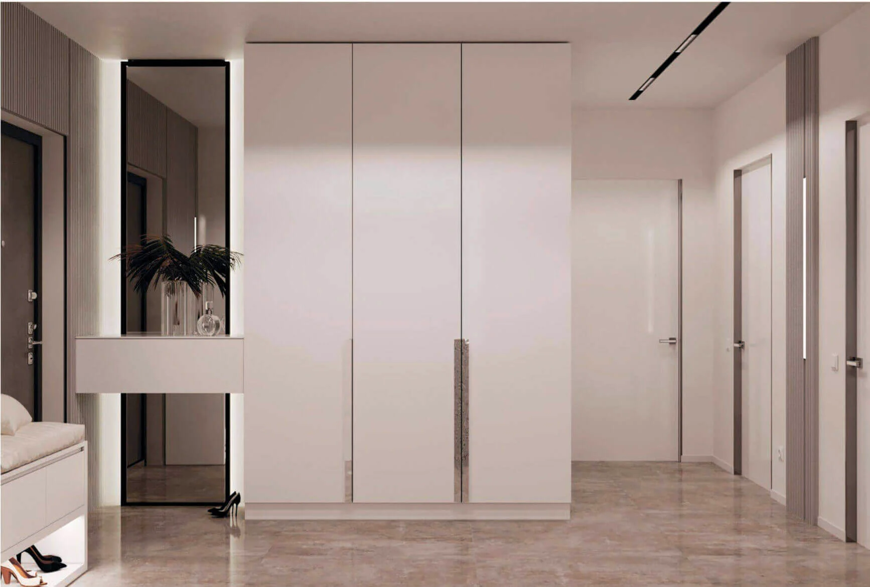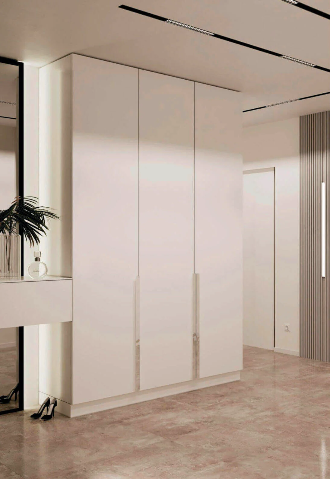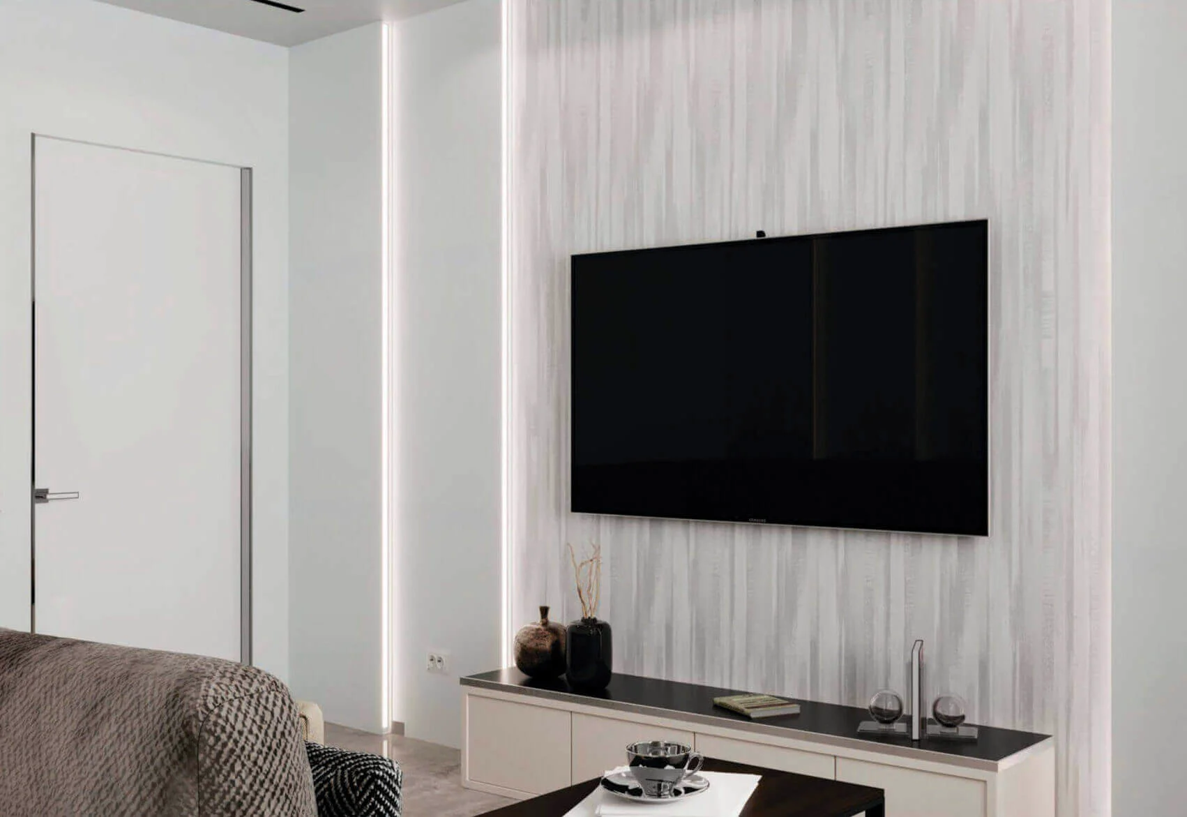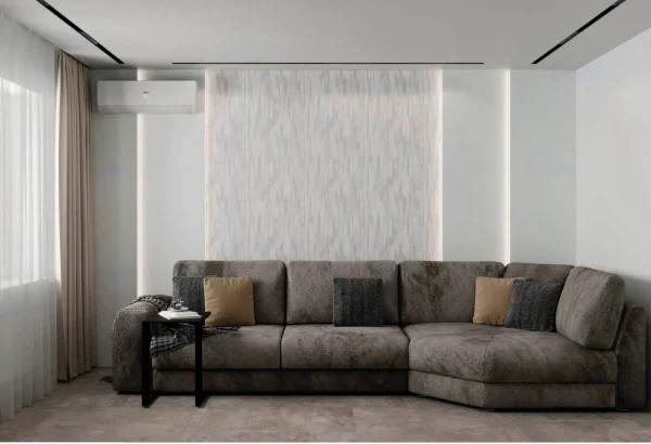 В проекте мы активно использовали стеновые панели разных оттенков и форм. Они добавляют игру фактур и цвета. Также на стенах использованы обои необычных оттенков и необычной мягкой текстуры.